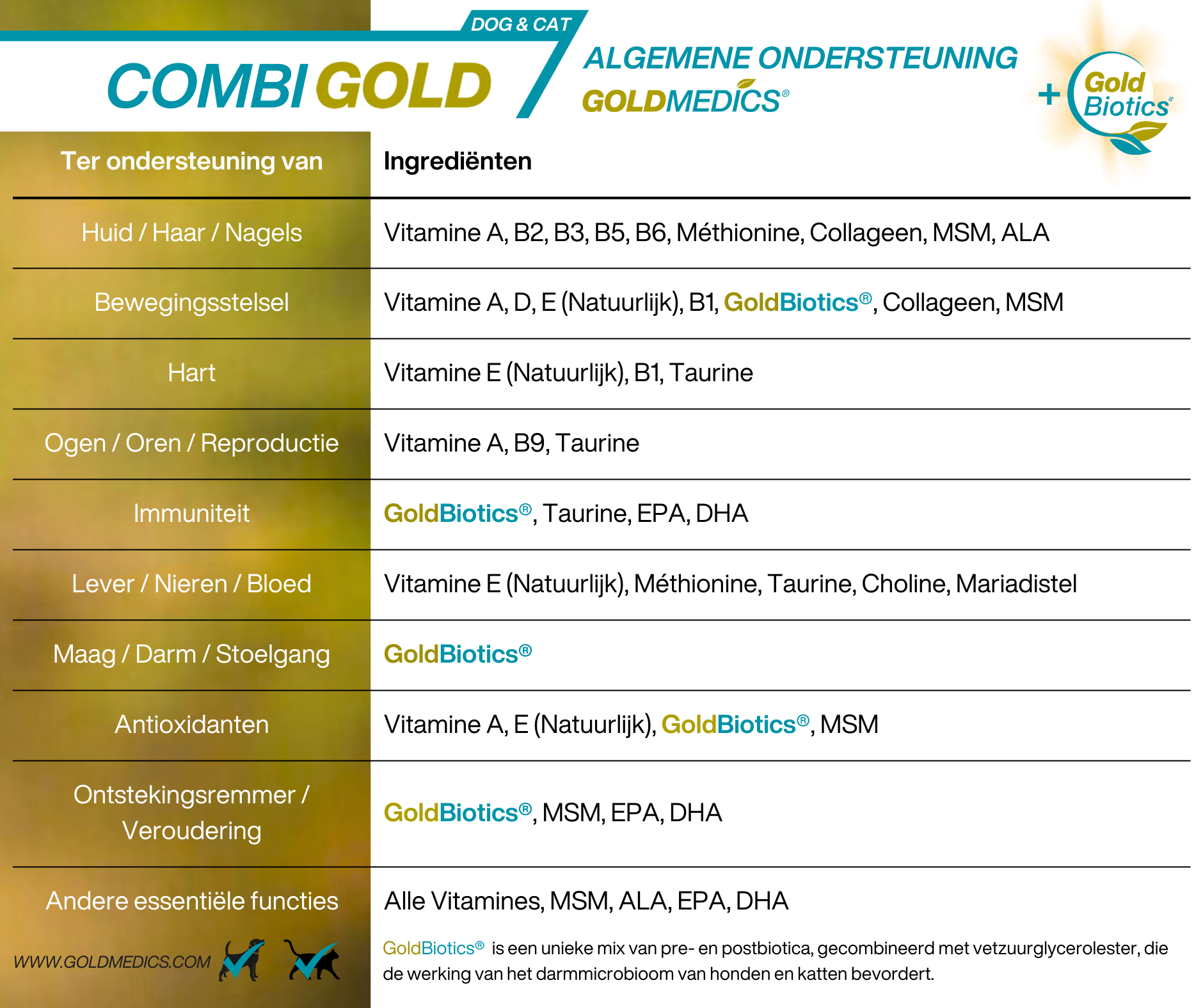 COMBI GOLD is een synergetisch mengsel van nutritionele ingrediënten zoals nog niet eerder op de markt beschikbaar is. In plaats van meerdere supplementen tegelijk te geven, biedt COMBI GOLD een alles-in-één oplossing, tenzij er sprake is van specifieke of ernstige gezondheidsproblemen.